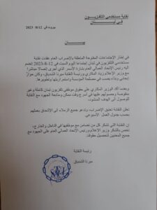 أعلنت نقابة مستخدمي التلفزيون في لبنان تعليق الإضراب، ودعت جميع الزملاء إلى الإلتحاق بعملهم بحسب جدول العمال الأسبوعي.