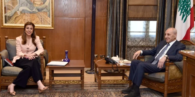 في إطار متابعة التطورات السياسية والميدانية في لبنان، استقبل رئيس مجلس النواب اللبناني، نبيه بري، في مقر الرئاسة الثانية في عين التينة، نائبة المبعوث الأميركي الخاص إلى الشرق الأوسط، مورغان أورتاغوس، التي كانت بصحبة وفد دبلوماسي ضمّ السفيرة الأميركية في لبنان، ليزا جونسون، والمستشار الإعلامي للرئيس بري، علي حمدان.
