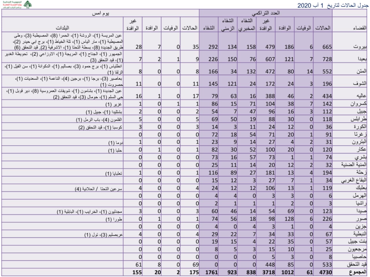 ونشرت وزارة الصحة العامة اليوم السبت، جدولاً بيّنت فيه كيف توزّعت الـ 175 إصابة جديدة بفيروس كورونا على الأقضية والمناطق اللبنانية.