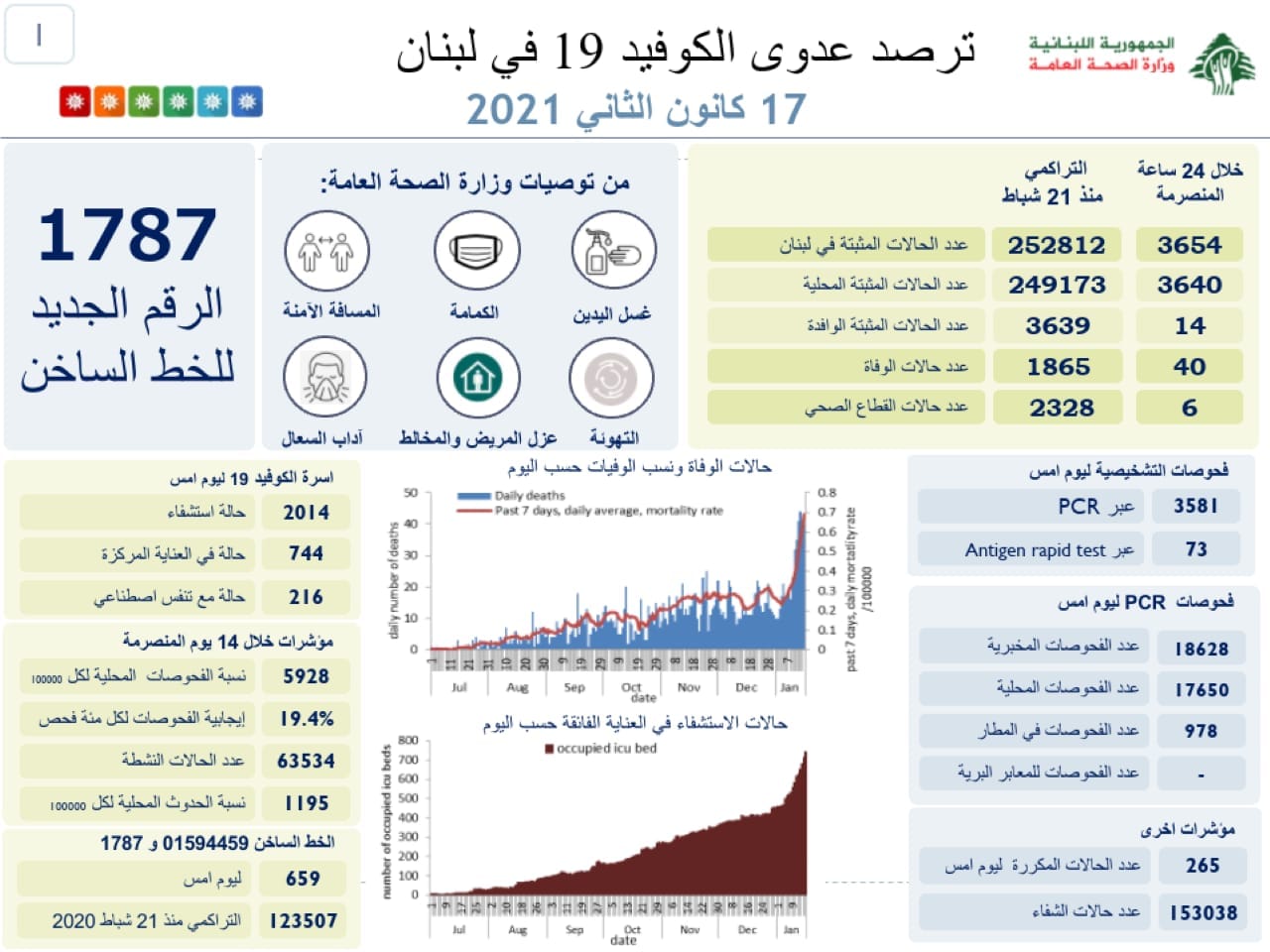 وأوضحت أنّه “تمّ تسجيل 3640 حالة إصابة بين المقيمين و14 حالة بين الوافدين”، مشيرةً إلى أنّه “تمّ تسجيل 40 حالة وفاة جديدة خلال الساعات الـ24 الماضية، ليرتفع العدد الإجمالي للوفيات إلى 1865”. وذكرت أنّ “عدد حالات الاستشفاء ليوم أمس هو 2014، من بينها 744 حالة في العناية المركّزة”.