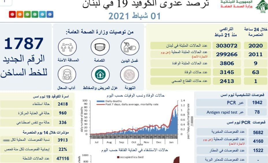 ولفتت الوزارة في تقريرها إلى أنّ “الحالات الجديدة التي سُجلت خلال الساعات الـ24 الماضية، انقسمت بين 2011 ضمن المقيمين و 9 ضمن الوافدين”، مشيرة إلى أنّ “عدد حالات الشفاء من الفيروس المستجد في لبنان بلغ 183263، في حين أن العدد التراكمي للوفيات هو 3145، إذ تمّ تسجيل 63 حالات وفاة جديدة خلال الساعات الـ24 المنصرمة”.