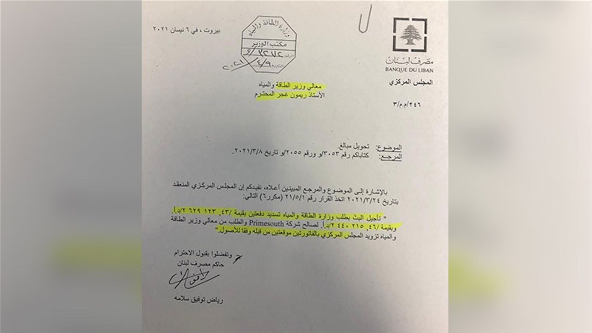 “قرّر المجلس المركزي في مصرف لبنان تأجيل البت بطلب وزارة الطاقة والمياه تسديد دفعتين الاولى بقيمة 2,6 مليون دولار أميركي والثانية بقيمة 2,4 مليون دولار أميركي، لصالح شركة Primesouth المكلفة بصيانة وتشغيل معملي دير عمار والزهراني، وأتى قرار المجلس المركزي بعد ان تبين وجود مخالفات في الفاتورتين.