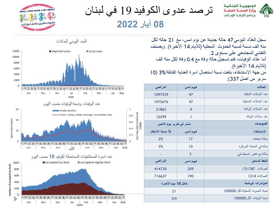 أعلنت وزارة الصحة العامّة في تقريرها اليومي حول مستجدات فيروس كورونا اليوم الأحد, عن “تسجيل 47 إصابة جديدة بكورونا (47 محلية و0 وافدة) ليصبح العدد الإجمالي للإصابات 1097539”. ولفتت الوزارة في تقريرها، إلى تسجيل “حالة وفاة جديدة، وبذلك يصبح العدد الإجمالي للوفيات 10399”.